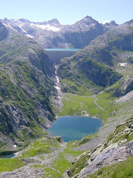 View on the reservoir "Lago di Cavagnöö" (in the background) in Southern Switzerland. (Image: Raimundo Sierra, GNU Free Documentation License)