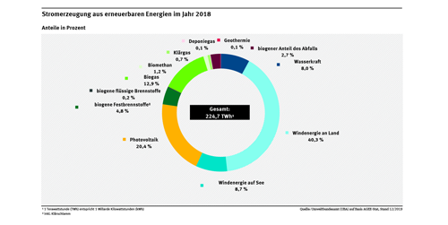 Die Stromerzeugung durch Photovoltaikanlagen stieg im Jahr 2019 auf 47,5 TWh an. Der Anstieg beträgt fast vier Prozent gegenüber dem Vorjahr. Der Zubau neu installierter PV-Anlagen geht seit einigen Jahren wieder nach oben. Der Anteil der Biomasse lag bei 50,4 TWh und war leicht rückläufig. Die Wasserkraft lag mit 20,2 TWh über dem Wert des sehr trockenen Vorjahrs. Der Anteil der Geothermie an der Stromerzeugung ist mit 0,2 TWh sehr gering. Den grössten Anteil an der erneuerbaren Stromerzeugung liefert die Windkraft mit 126 TWh. Die Windstromerzeugung stieg trotz des geringen Zubaus um 15 Prozent. Insgesamt liegt der Anteil der Erneuerbaren an der Stromerzeugung bei 42,1%. (akt. Zahlen Stand März 2020).
