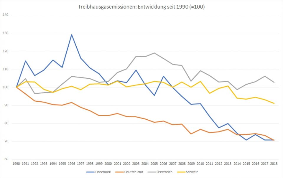 Dänemark hat die Treibhausgas-Emissionen seit 1990 um 37 Prozent reduziert. Bis 2030 sollen es 70 Prozent sein. (Quelle: Eurostat) Dänemark hat die Treibhausgas-Emissionen seit 1990 um 37 Prozent reduziert. Bis 2030 sollen es 70 Prozent sein. (Quelle: Eurostat)