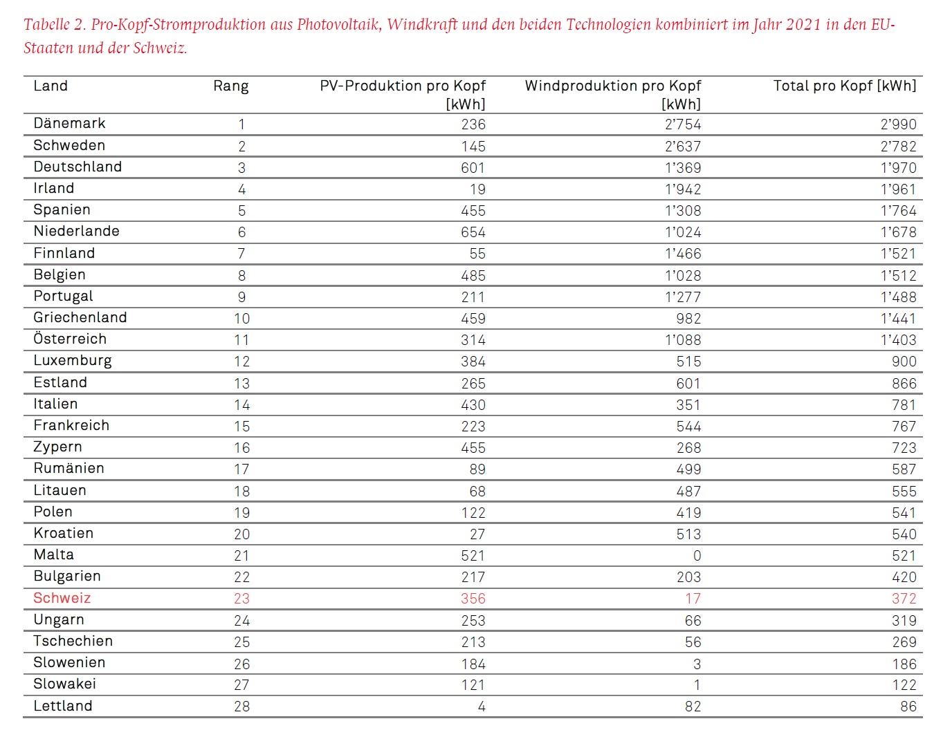 Die Schweiz, deren Solarstrom-Potenzial alleine im Gebäudesektor höher ist als der aktuelle Stromendverbrauch, schafft derweil gerade etwas über fünf Prozent. Der Ausbau kommt zwar einigermassen voran, aber viel zu schleppend, um auch nur in die Reichweite der Ausbauziele zu kommen. Das wird die grosse Stromlücke der Zukunft sein, wenn die Atomkraftwerke in zehn bis zwanzig Jahren abgeschaltet werden. Die Windstromnutzung verharrt gar nahe am Stillstand, und auch wenn die Ausbauziele wegen der in der Regel ungünstigen Bedingungen weit tiefer liegen, so wäre es doch zur Schliessung der «Winterlücken», wenn die Solarstromproduktion deutlich sinkt, dringend nötig, den Ausbau voranzutreiben. Die Schweiz hat ihren einstigen Vorsprung mit einem Anteil von 35 Prozent Strom aus Wasserkraft längst verspielt und reihenweise Chancen verpasst, zügig die neuen erneuerbaren Energien auszubauen.