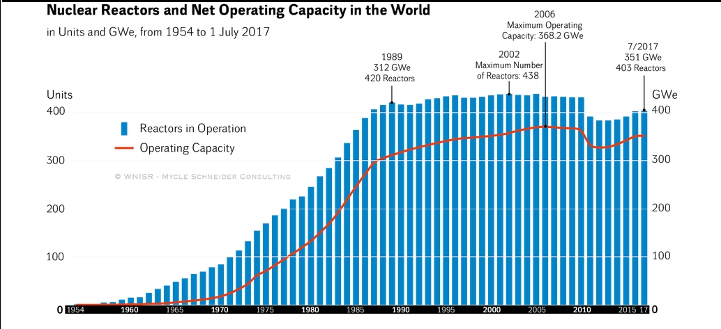 Das goldene Zeitalter der Nuklearenergie ist zumindest bis auf weiteres vorbei. Während im Rekordjahr 1976 weltweit gleich mit dem Bau von 44 Atomkraftwerken begonnen wurde, war es 2017 bislang gerade noch ein einziges in Indien. Insgesamt werden derzeit 52 Reaktoren mit einer Kapazität von 53,2 Gigawatt gebaut. 20 davon alleine finden sich in China. Das Land verfolgt nicht nur mit erneuerbaren Energien ehrgeizige Pläne, um von der extremen Abhängigkeit der klimaschädlichen Kohle wegzukommen, deren Emissionen in Chinas Grossstädte Smog verursachen, der Zehntausenden das Leben kostet. Bereits heute liegt China nach den USA und Frankreich an dritter Stelle der grössten Atomstromproduzenten weltweit, und auch wenn die Dynamik etwas abgenommen hat, so ist absehbar, dass China die Nummer eins der Welt werden dürfte. Denn in den Vereinigten Staaten und Frankreich läuft fast gar nichts mehr. Während der neue französische Staatspräsident Emanuel Macron mit einer komfortablen Parlamentsmehrheit und einem atomskeptischen Umweltminister mit dem Vorhaben der Vorgängerregierung Ernst machen will und den Anteil des Atomstroms binnen nur eines knappen Jahrzehnts von 75 auf 50 Prozent herunterschrauben will, gibt sich sein Amtskollege Donald Trump in den USA zwar betont atomenergiefreundlich, hat sich anderseits aber geweigert, weitere Zuschüsse für das vor dem Scheitern stehende Projekt V.C. Summer in South Carolina zu bewilligen. Nach vier Jahren Bauzeit ist dieses gerade zu einem Drittel fertig gestellt, und die Kosten sind aus dem Ruder gelaufen. Nun steht das ganze Vorhaben auf der Kippe. Eine nukleare Zukunft sähe anders aus als die Laufzeitverlängerungen auf 60 Jahre, mit denen schon die Vorgängerregierung unter Barack Obama auf Zeit gespielt hatte. 84 der 99 Atomkraftwerke verfügen inzwischen über entsprechende Bewilligungen. Das heisst allerdings noch nicht, dass diese auch wahrgenommen werden. Einige AKW’s sind in den vergangenen Jahren trotz verlängerter Bewilligung aus finanziellen Gründen stillgelegt worden.