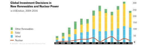 Und, das zeigen die Zahlen im vom Energieberater Mycle Schneider herausgegebenen «World Nuclear Industry Status Report»: Die erneuerbaren Energien Wind und Sonne haben der nuklearen Energie, was den Zubau betritt, schon lange den Rang abgelaufen. Seit 1997, als das Kyoto-Protokoll zum Klimawandel unterzeichnet wurde, ist mit zusätzlichen 948 Terrawattstunden Wind- und 332 TWh Sonnenstrom ein Mehrfaches des Wachstums an Nuklearstrom (212 TWh), produziert worden. In den Ländern der Europäischen Union ist die Produktion von Nuklearstrom in den Jahren 1997 bis 2014 mit einem Minus von 82 TWh sogar deutlich zurückgegangen, wurde aber mit einem Plus von 292 TWh an Wind- und 222 TWh an Sonnenstrom mehr als aufgefangen.